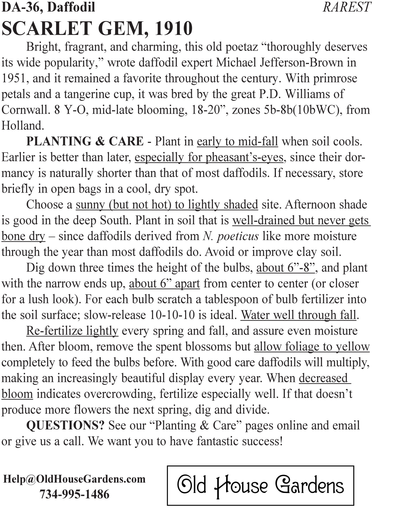 PLANTING & CAREPlant in mid-fall when soil cools; earlier is better than later. If necessary, store till then in open bags in a cool, dry spot. Choose a sunny to lightly shaded site. Full sun is best in the North, but the further South you garden, the more shade you can give them. (You’ll find additional expert advice for growing daffodils where winters are warm in our “Daffodils for the South and Warm West.”) Plant in well-drained soil. Avoid or improve clay soil, or grow in raised beds. Dig down three times the height of the bulbs, about 6-8 inches for standard varieties, 4-6 for smaller varieties such as ‘W.P. Milner’, and plant with the narrow ends up, about 6 inches apart from center to center (or closer for a lush look). For each bulb scratch a tablespoon of bulb fertilizer into the surface (slow-release 10-10-10 is ideal). Water, and keep moist through the fall while the bulbs are growing new roots, through the winter if the soil doesn’t freeze, and through the spring at least till blooming is finished. Re-fertilize lightly every spring and fall. After bloom, remove the spent blossoms but allow foliage to yellow completely (to feed the bulbs for next year’s bloom) before removing it. IN THE SOUTH, keep soil dry when soil warms up after blooming and through the summer to avoid disease problems. Deer, rodents, and most other pests leave daffodils alone, but if some of yours mysteriously fail to appear in the spring, visit our Daffodil Bulb Fly page to learn about the likely culprit. With good care daffodils will multiply, making an increasingly beautiful display every year. When decreased bloom indicates overcrowding, dig and divide after foliage yellows. Tazetta narcissus are almost as easy to force as their cousins, paperwhites. For simple how-to, see our Forcing Bulbs page. Learn more about growing and enjoying daffodils at our Daffodils Newsletter Archives and Bulbs as Cut-Flowers page. |