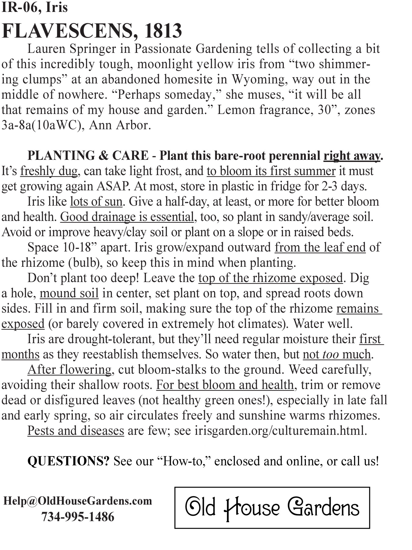 PLANTING & CAREUnlike most sources, we ship our iris as bare-root plants in the spring. (See an example here.) Plant them right away. They’re freshly dug, can take light frost, and to bloom their first summer they must get growing again ASAP. If necessary, store in the fridge for 2-3 days or “heel in” briefly in moist sand or soil. Iris like lots of sun. Give them half a day, at least, or more for increased bloom and better health. Good drainage is essential, too, so plant in sandy to average soil. Avoid or improve heavy (clay) soil or plant on a slope or in raised beds. Space 10-18 inches apart. Iris grow/expand outward from the leaf end of the rhizome (bulb), so keep this in mind when arranging and planting them. Don’t plant too deep! Leave the top of the rhizome exposed. Dig a hole, mound soil in the center, set plant on top, and spread roots down the sides of the mound. Fill in and firm soil, making sure that the top of the rhizome remains exposed (or barely covered in extremely hot climates). Water well. Though iris are drought-tolerant and will rot in soil that’s too wet, they’ll need regular moisture the first few months after planting as they reestablish themselves. So water them, but not too much. Let your green thumb be your guide. After flowering, cut bloom-stalks to the ground. Weed carefully to avoid damaging shallow feeder-roots. For best bloom and health, trim or remove dead or disfigured leaves (but not healthy green ones!), especially in late fall and early spring, so air can circulate freely and sunshine can warm the rhizomes. After a few years of vigorous growth, your iris may get so crowded that their bloom and health begin to suffer. To thin or divide them, wait 4-8 weeks after bloom and then either open up the clump by removing the oldest rhizomes from the center, or dig it all, replant the best new rhizomes, and give away or destroy (don’t compost) the others. Iris have relatively few pests or diseases that trouble them. For helpful advice on the most common ones — iris borer (which is only a problem east of the Rockies), leaf spot, and root rot — see the excellent Iris Garden website sponsored by the iris societies of New England. Learn more about growing and enjoying iris at our Iris Newsletter Archives and Bulbs as Cut-Flowers page. |